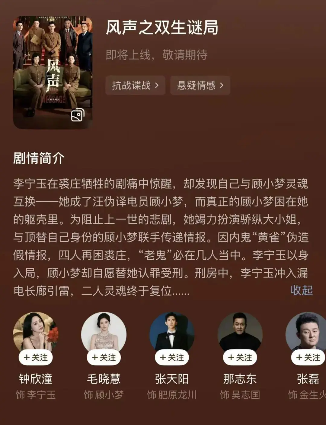 4月2日,短剧版《风声》发布预告,改编自麦家长篇小说《风声》。短剧《风声之双生迷局》由钟欣潼、毛晓慧主演。该剧已上线平台预约。