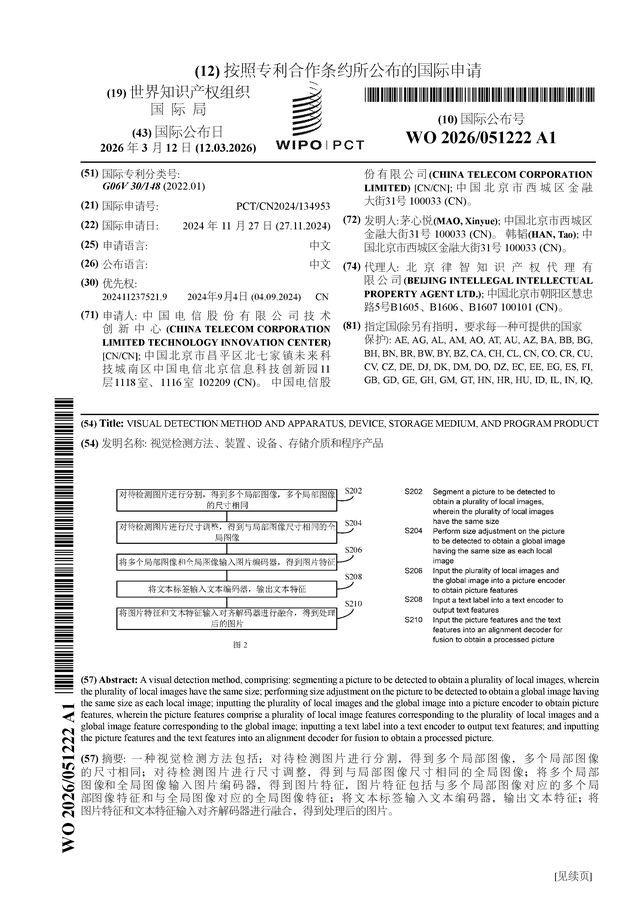 证券之星消息,根据企查查数据显示中国电信(601728)公布了一项国际专利申请,专利名为“视觉检测方法、装置、设备、存储介质和程序产品”,专利申请号为PCT/CN2024/134953,国际公布日为2026年3月12日。