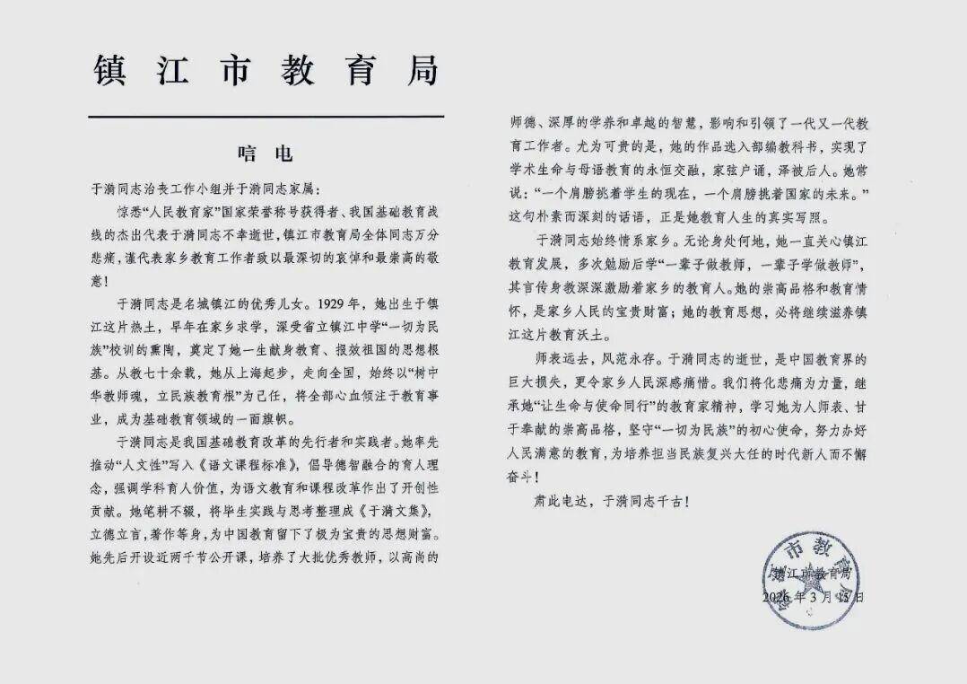 镇江教育系统将以于漪先生为榜样,深入学习传承“心有大我、至诚报国的理想信念;言为士则、行为世范的品格风范;启智润心、因材施教的育人智慧;勤学笃行、求是创新的躬耕态度;乐教爱生、甘于奉献的仁爱之心;胸怀天下、着眼未来的担当精神”,把缅怀之情转化为育人之力,让教育家精神在镇江校园落地生根、开花结果,为培养担当民族复兴大任的时代新人贡献教育力量。
